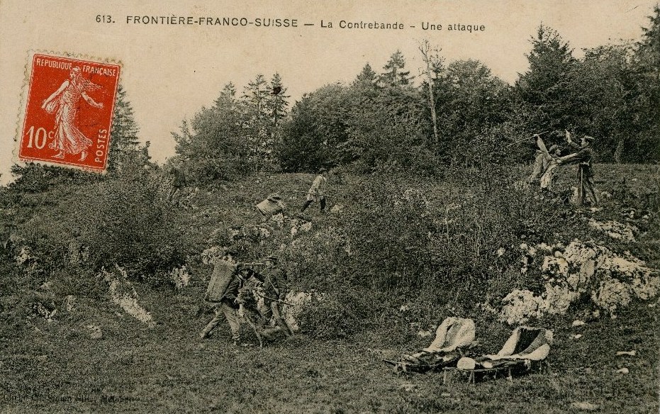 Attaque douanière contre des contrebandiers ; Carte postale en noir et blanc représentant une attaque de douaniers face à des contrebandiers. Le cliché est une mise en scène qui se passe à proximité de la frontière franco-suisse.