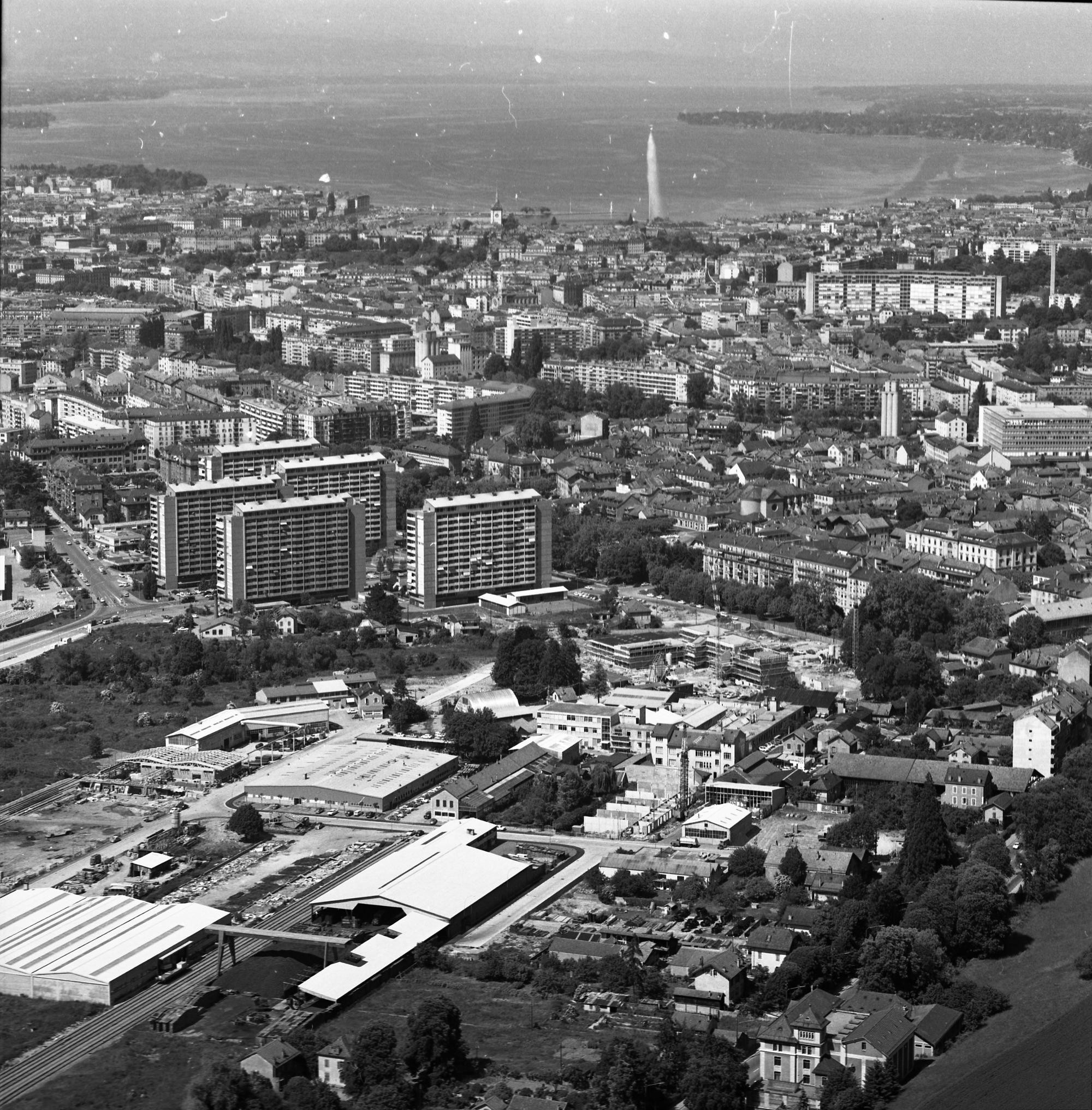 Vue aérienne du quartier et des Tours de Carouge en direction du lac, prise par la photographe Gertrude Trepper