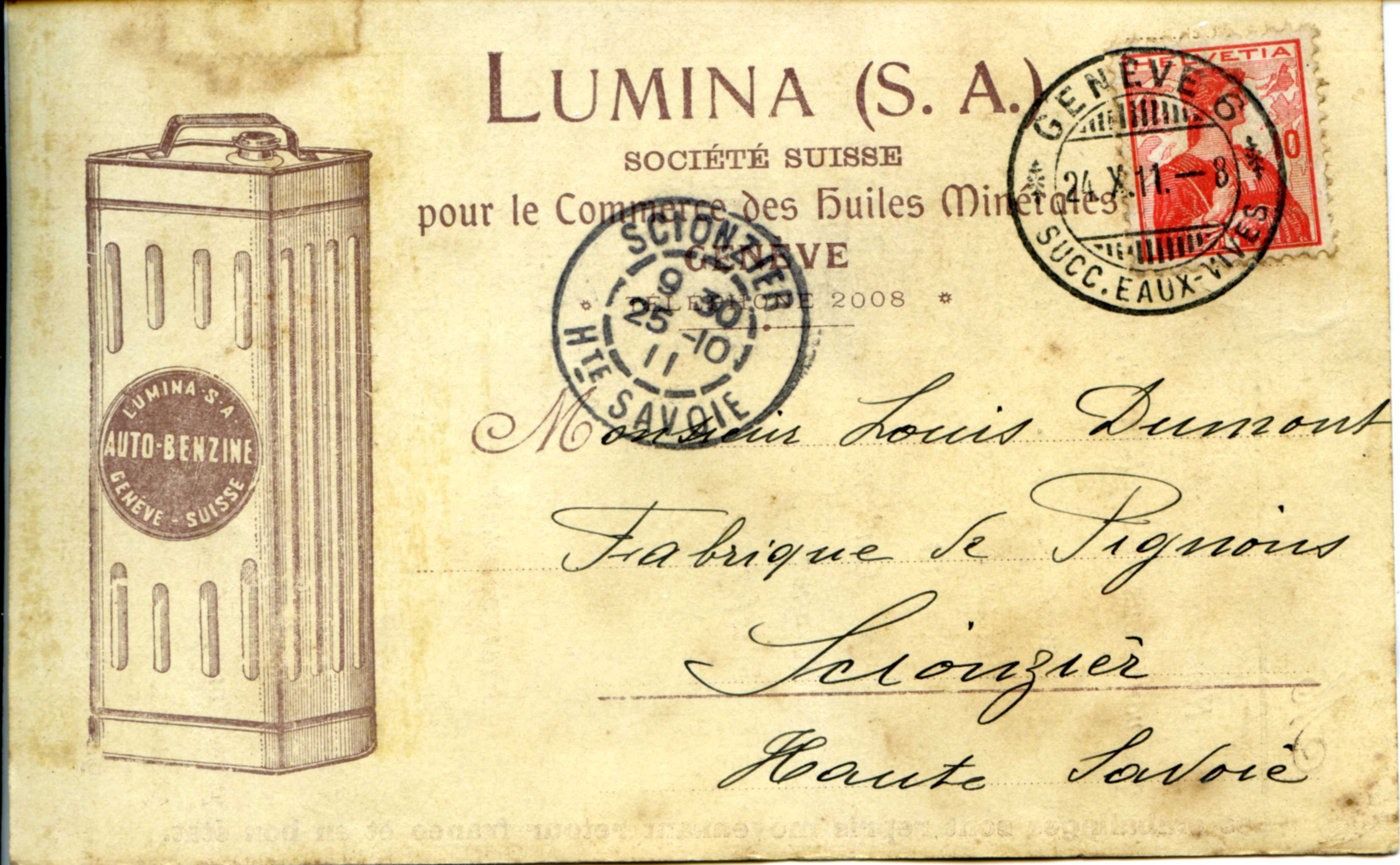 Carte postale commerciale des Ets LUMINA à Genève, adressée aux Ets DUMONT à Scionzier affranchie le 25/10/1911. Les Ets LUMINA étaient spécialisés dans le commerce d’huiles minérales. Les Ets Eugène DUMONT étaient une fabrique de décolletage dans la vallée de l'Arve. Ce document atteste des échanges économiques entre le territoire savoyard et la Suisse voisine. A noter qu'à cette date, la zone franche favorisait les échanges entre le territoire savoyard et le canton de Genève.