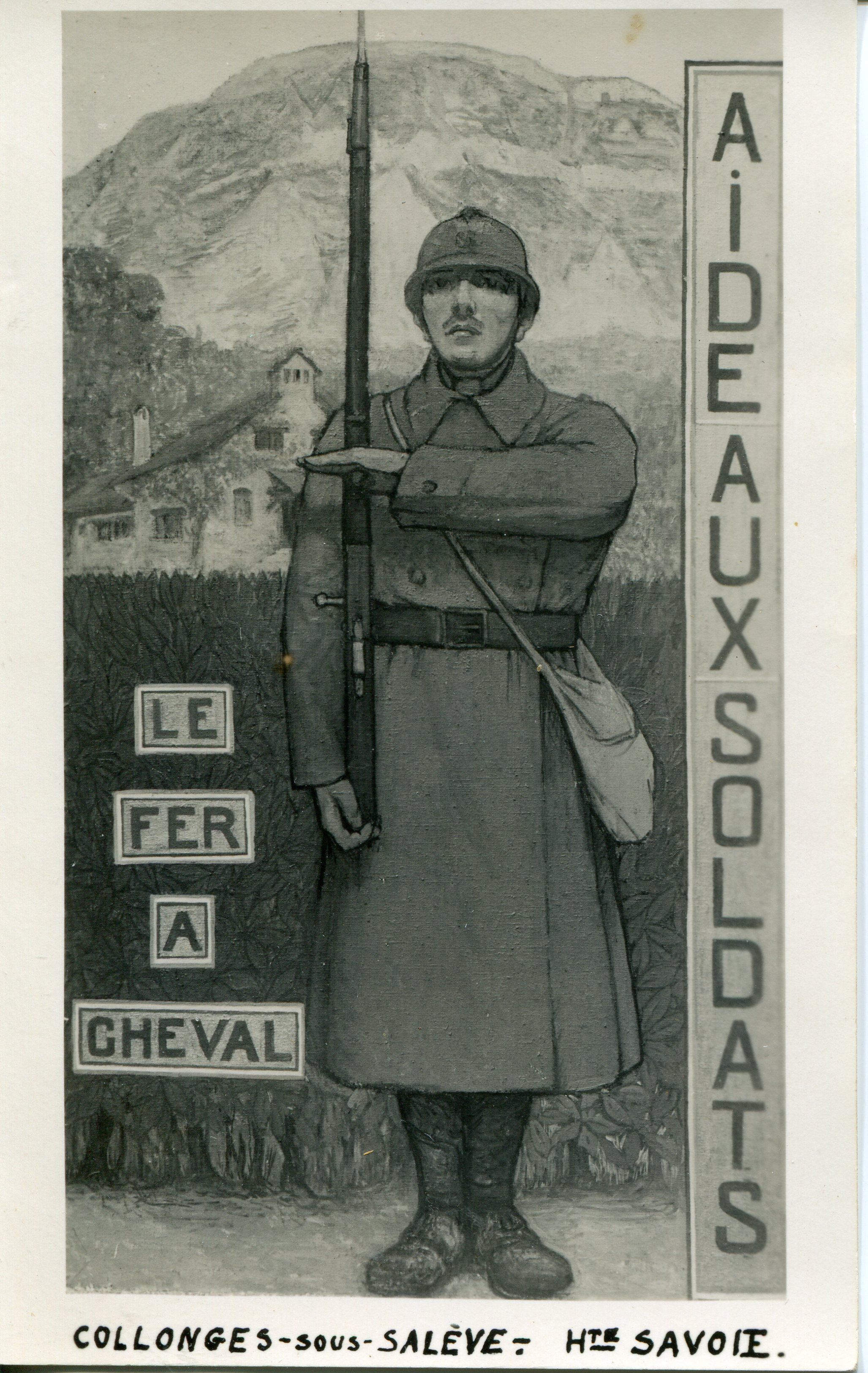 Carte postale souvenir de l'ouvroir de Collonges-sous-Salève (1939). Ce dessin présente l'Aide aux Soldats, le premier ouvroir de France fondé en septembre 1939 par Renée Blanche BOISSIER; au second plan la salle du Fer à Cheval à Collonges et au loin les rochers du Grand Salève ».