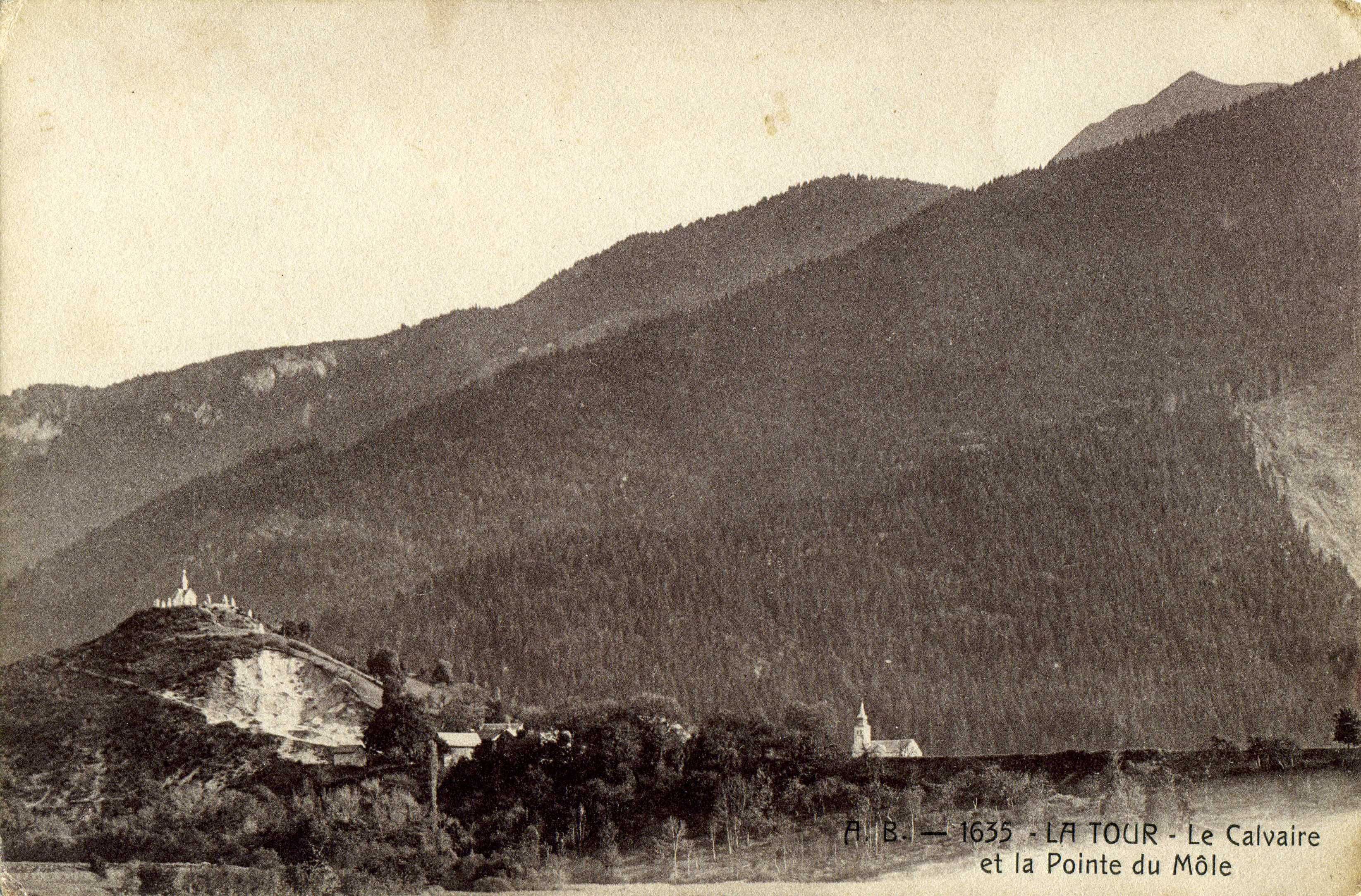 A l'origine, la colline du Calvaire était herbeuse et ne portait rien en son sommet, pas même quelques sapins (plantés en 1901). Son nom changea au fil du temps: Petit Môle, la forteresse, le Pain de Sucre ou encore Tour du guidon. Sur l'idée du curé Bonnaz, une chapelle dédiée à Notre-Dame des Sept Douleurs y fut construite dans un style néo-gothique et inaugurée le 15 septembre 1889, soit dix ans environ après la fin de la construction du chemin de croix.