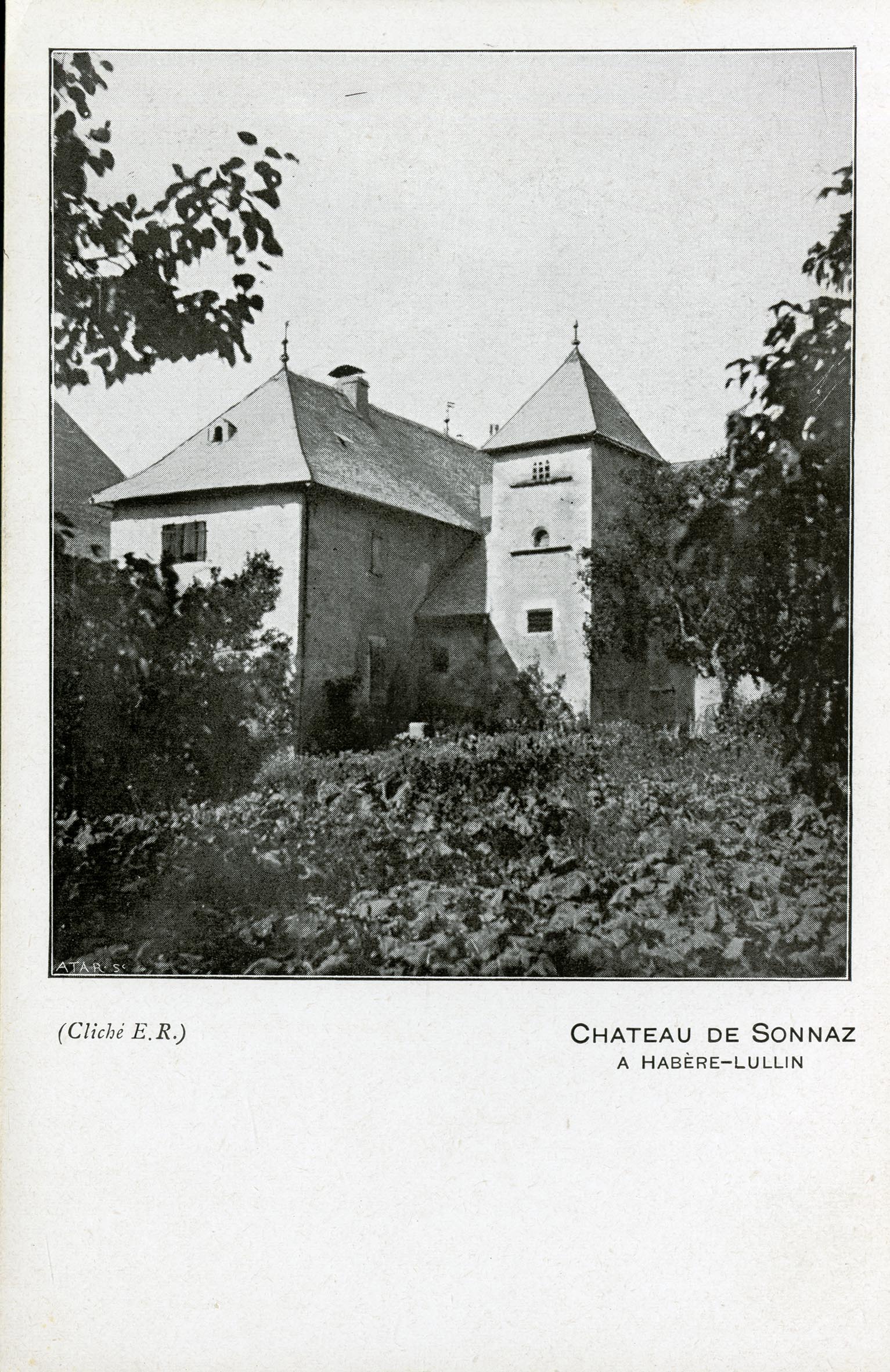 Carte postale en noir/blanc du Château de la famille Sonnaz à Habère-Lullin qui fut détruit par un incendie en 1943 en représaille par les Nazis qui exécutèrent vingt-cinq personnes.