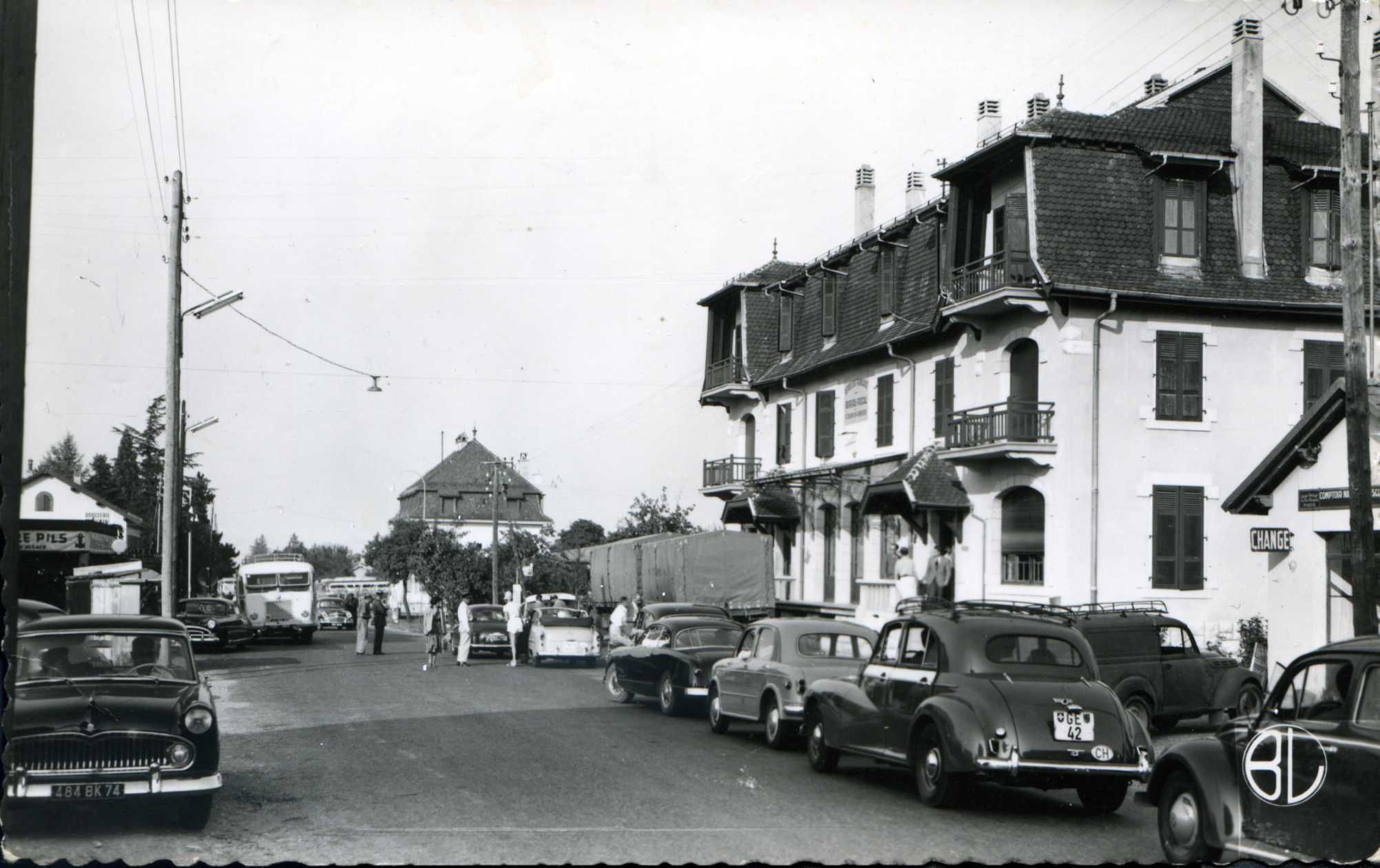 Douane de Perly à Saint-Julien-en-Genevois : contrôle à la frontière ; Cette photographie noir et blanc figure une scène de contrôle des véhicules à la douane franco-suisse de Perly à Saint-Julien-en-Genevois. On observe la file d'attente des voitures (voitures anciennes) qui patientent devant le bâtiment des douanes. A droite de celui-ci, une petite maison : le bureau de change.