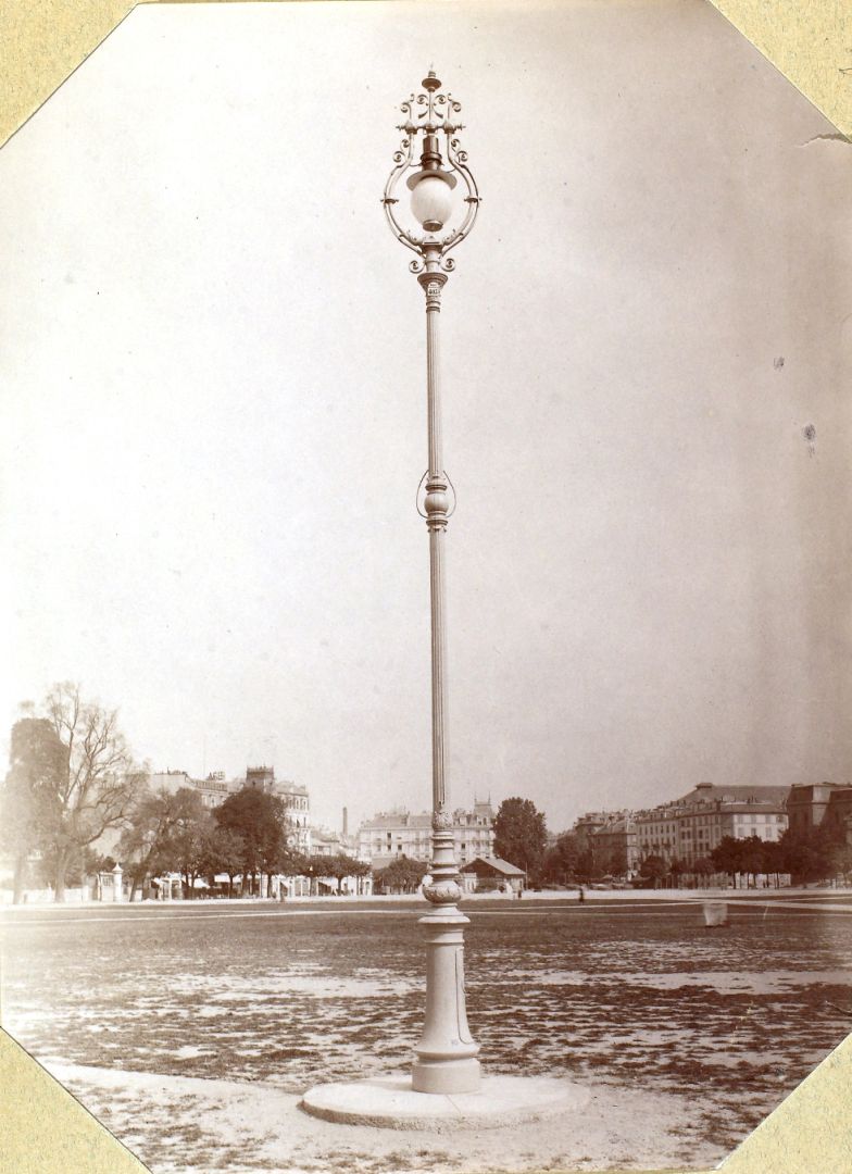 Sur l'image: ume lampe à arc de 20 ampères installée au milieu de la Plaine de Plainpalais.