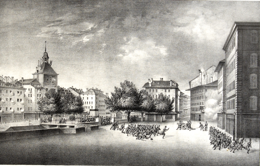 Le refus du gouvernement genevois de soutenir à la Diète fédérale la dissolution du Sonderbund, alliance formée par sept cantons catholiques, est l’étincelle qui provoque la Révolution radicale d'octobre1846. Début octobre, les barricades s’élèvent dans le quartier de St-Gervais, la milice tentant d’y pénétrer est repoussée. Les affrontements font plus de vingt morts et provoquent la démission du Conseil d’Etat puis la dissolution du Grand Conseil. Ces événements marquent l’arrivée au pouvoir de James Fazy et des radicaux.