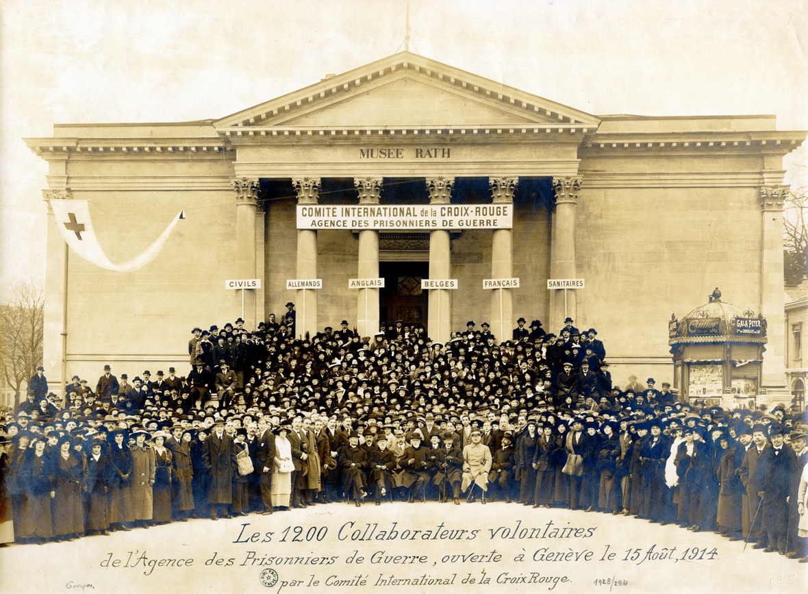 L'Agence internationale des prisonniers de Guerre créée en 1914 sur proposition de Gustave Ador, président de la Croix-Rouge, installée au Musée Rath dès le début de la guerre, a vu travailler 1200 bénévoles pour répertorier plus de quatre millions de fiches de prisonniers et acheminer près de deux millions de colis. Les noms de Genève et de la Croix Rouge rayonnent dans le monde entier.