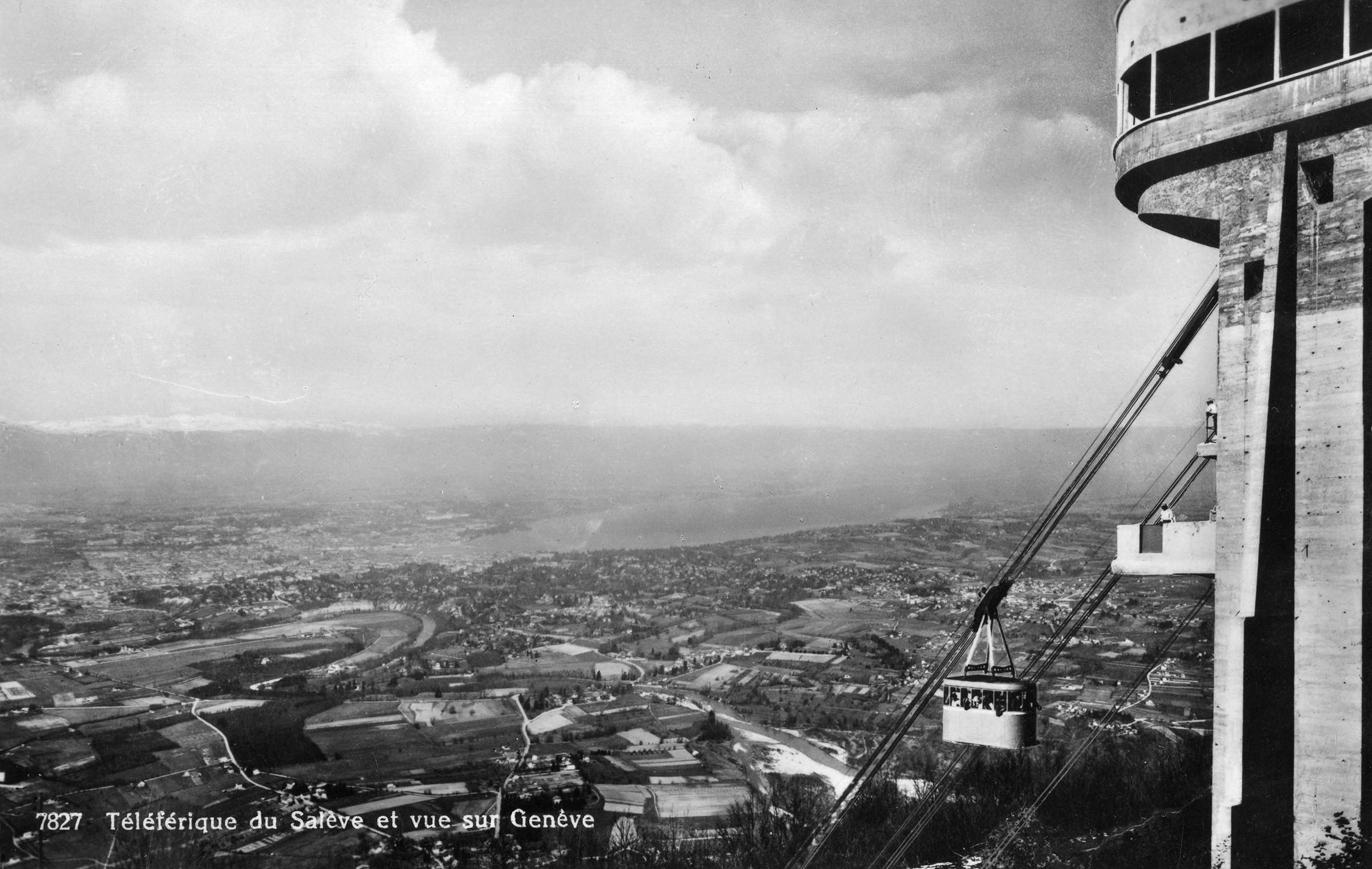 Carte postale noir/blanc du téléphérique du Salève, de sa station supérieure au départ d'une cabine, vue sur le Léman, la campagne genevoise, Genève et le Jura