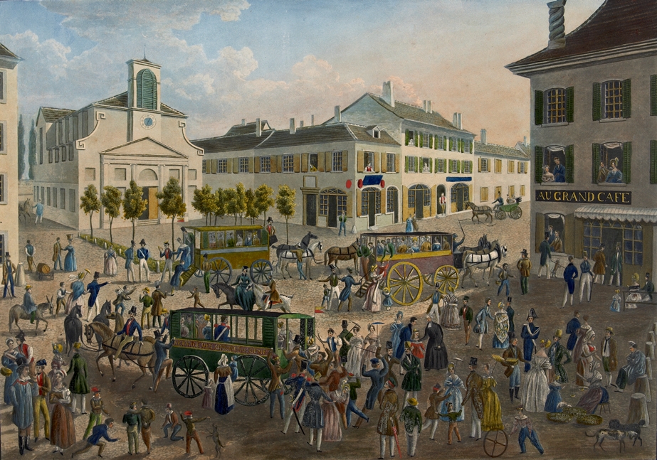 En septembre 1833, l’introduction d’une ligne omnibus de charrettes à chevaux entre la place du Marché à Carouge et la place Neuve marque la naissance du premier transport public à Genève. Le succès est tel que dans les mois suivants de nouvelles lignes sont ouvertes pour Saint-Julien, Chêne et Versoix.