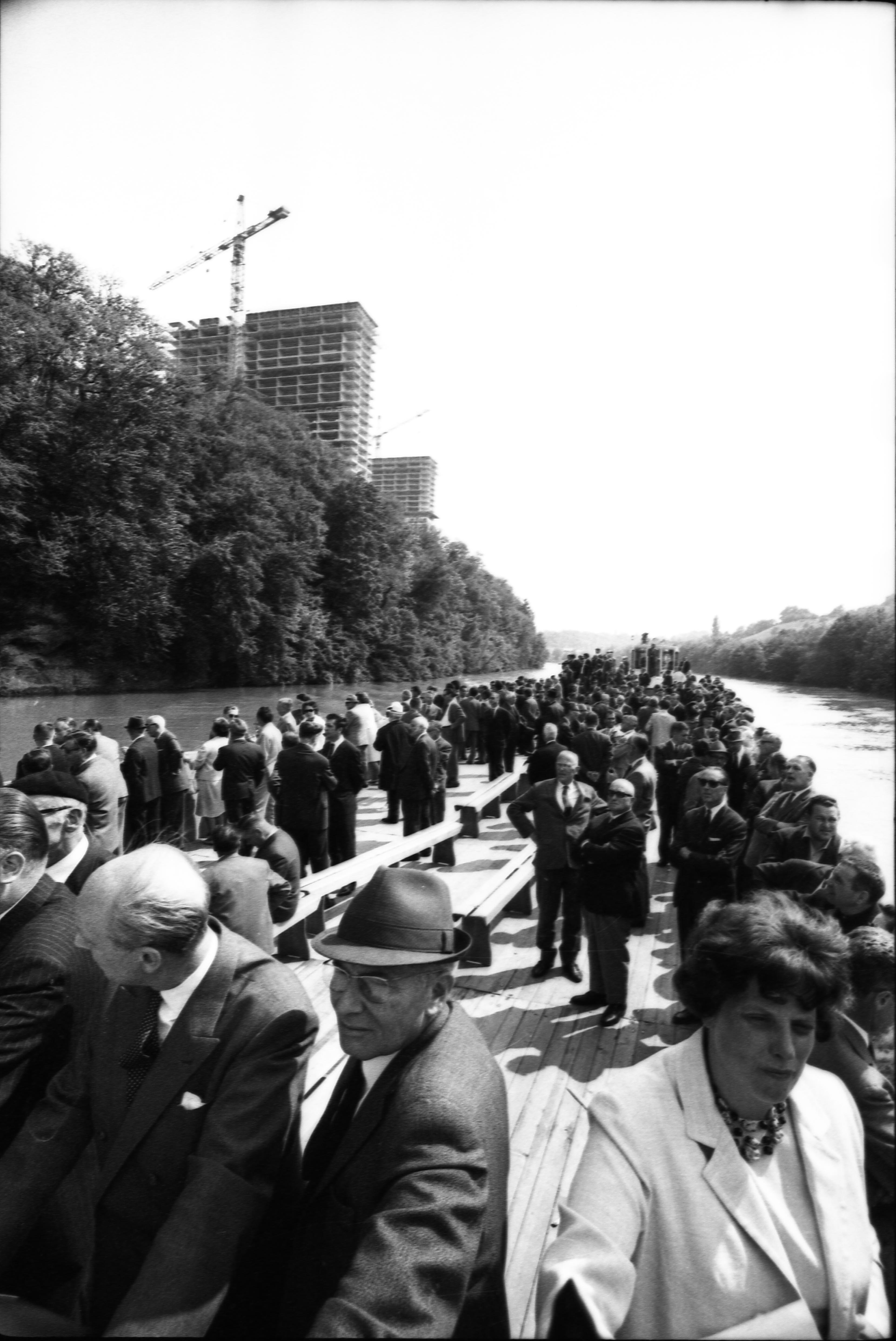 Image: la barge officielle se rend aux Cheneviers par le Rhône pour l'inauguration.
