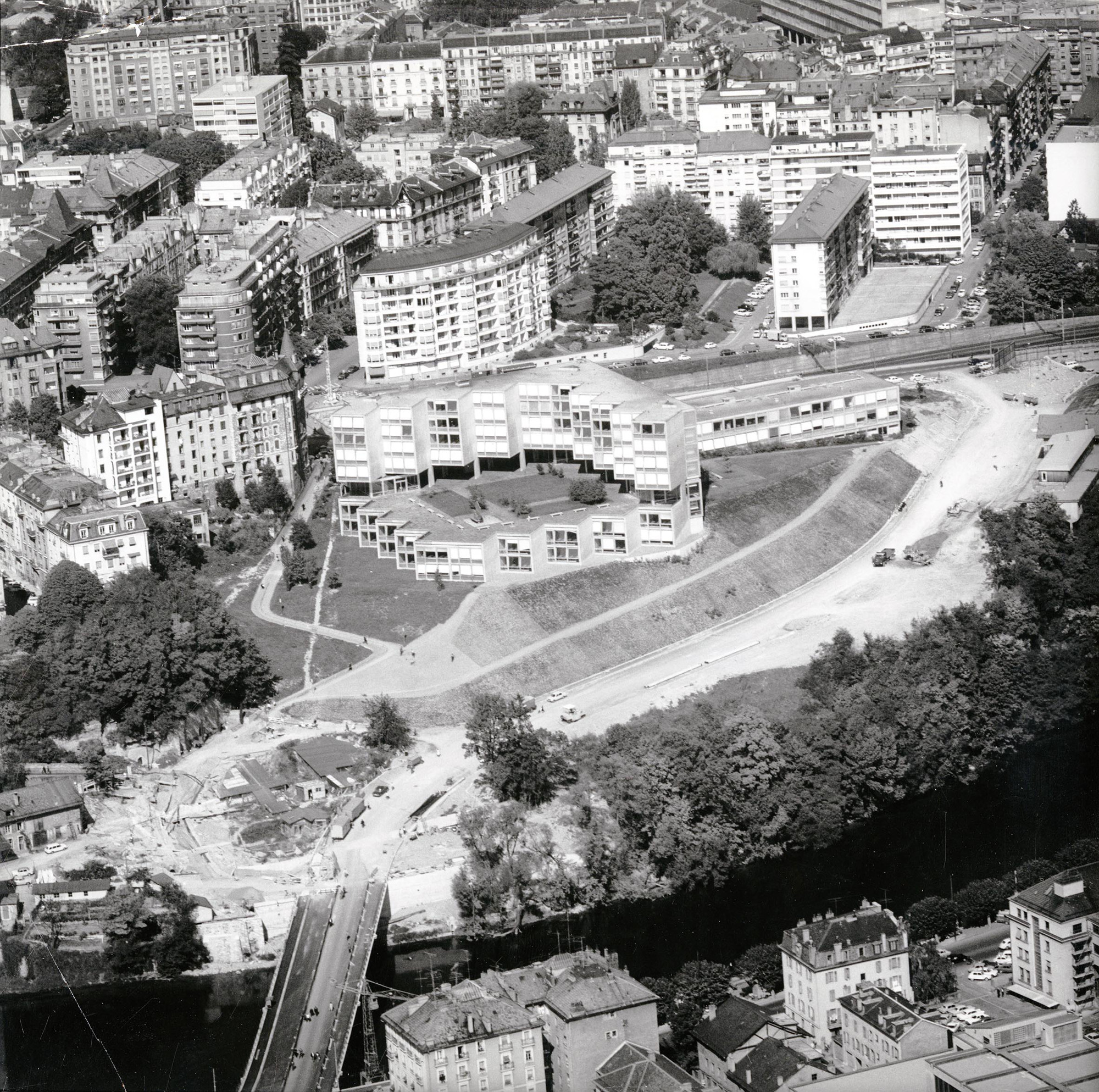 Vue aérienne du pont de Sous-Terre et du quartier de la St-Jean, prise par la photographe Gertrude Trepper.