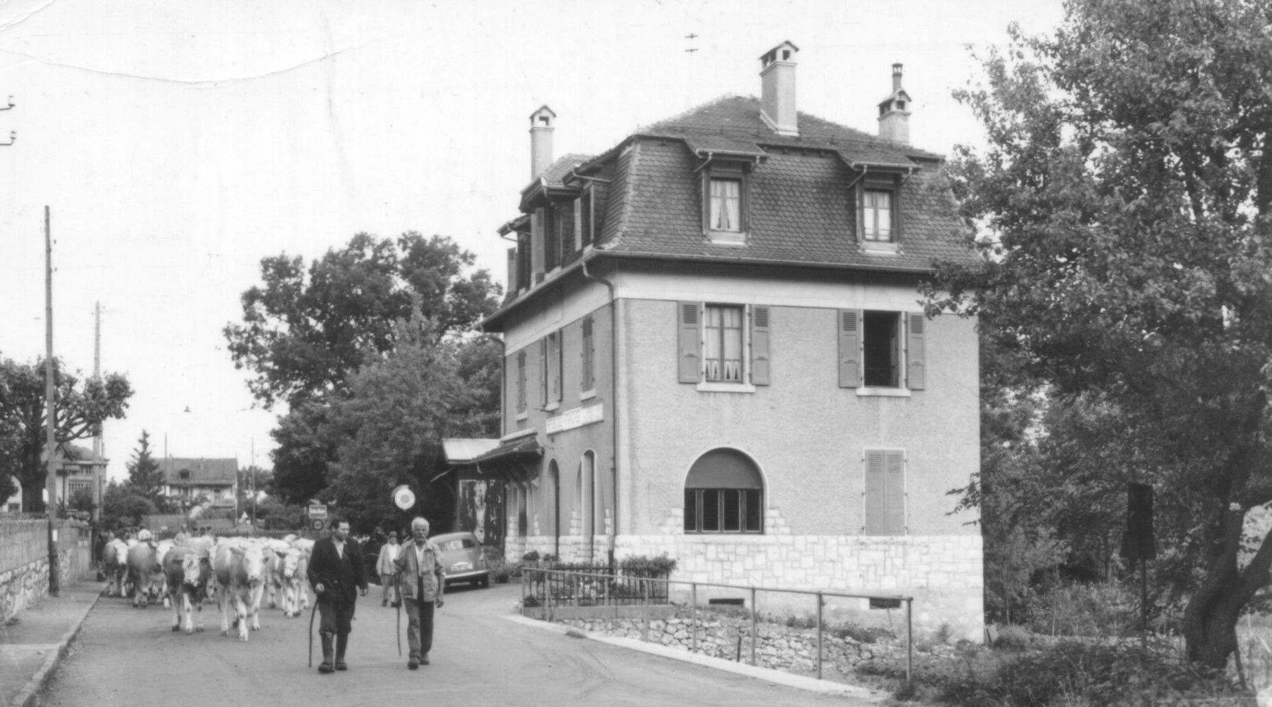 Vaches passant la frontière suisse (v. 1965). La Croix Rozon ; Photo des années 1960 ? Conduit par deux paysans (père et fils ?) un grand troupeau de vaches venant du hameau de La Croix-de-Rozon (Bardonnex, Suisse), s'apprête à traverser la frontière pour aller sur France. Dans un instant, ils passeront sur le pont qui enjambe la rivière de la Drize et arriveront à Collonges-sous-Salève (Haute-Savoie). A droite, le bureau fiscal français ; cet édifice a vu le jour après la suppression des zones en 1923 et fut construit sur les plans de l'architecte Fleury RAILLON (qui dessina aussi les bureaux de Perly, Moëllesullaz et tous les débarcadères douaniers du Léman français) ; le bâtiment fut livré en 1927.